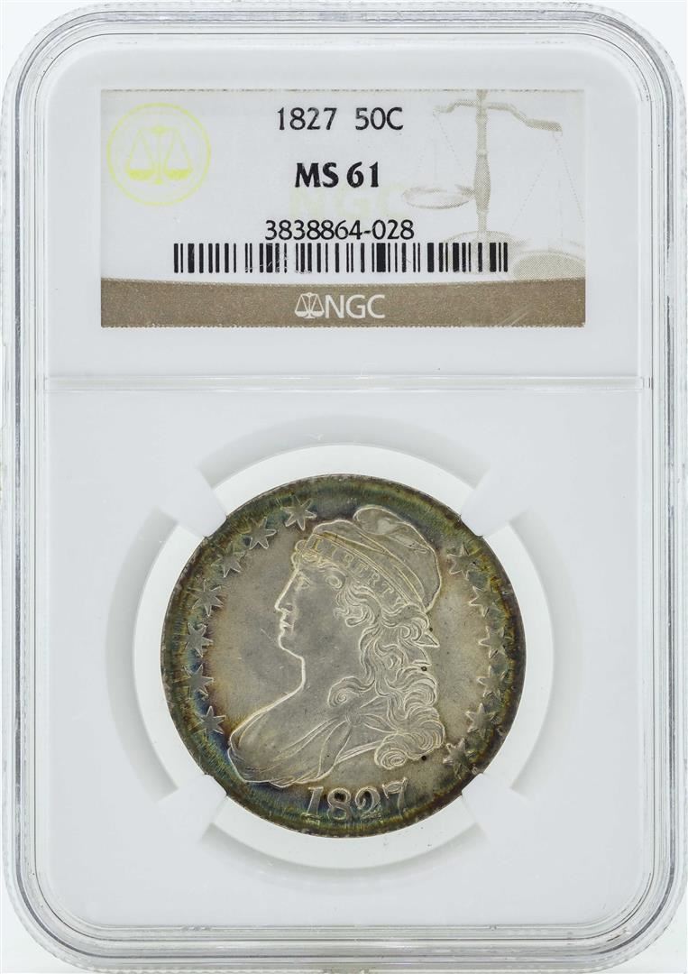 One 1827 Capped Bust Half Dollar Coin NGC MS61 - Great Toning. NGC Certified.