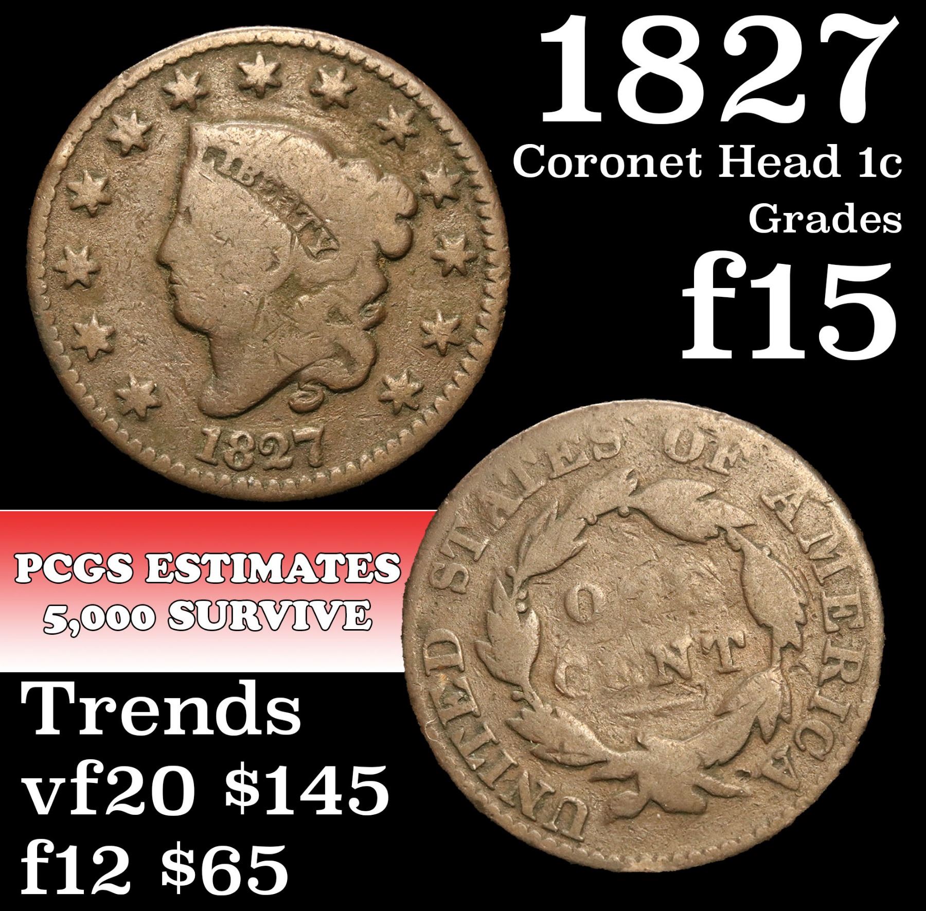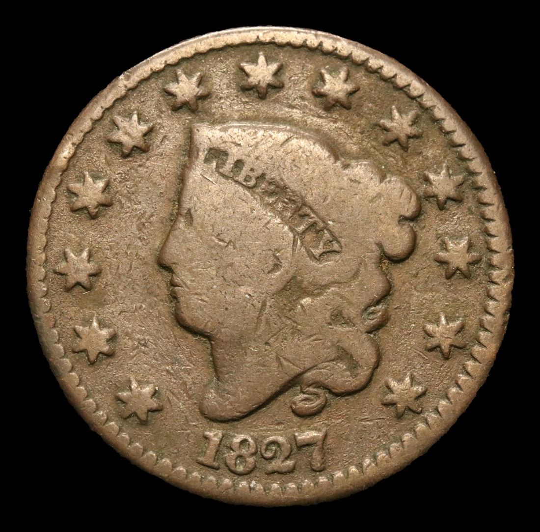 1827 Coronet Head Large Cent 1c Grades f+.