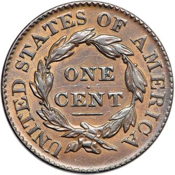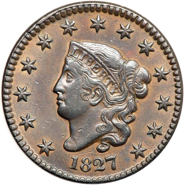 1827 N-1 R2 VF35+. VF-35+. Sharpness EF45 but there are some fine pinscratches in the field around ONE CENT plus a short, dull scratch above the 18 in the date and a few light contact marks on the neck. The devices are glossy dark steel brown while the protected areas are a frosty golden tan faded down from mint color. The obverse highpoints are a darker shade of steel brown, but the eye appeal remains quite nice for the grade. LDS showing a thin but very clear rim cud break from star 5 to star 6. Removed from an NCS slab graded "AU details, reverse scratched," and the NCS label is included. DWH #2600.