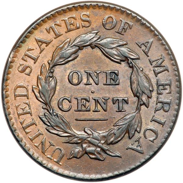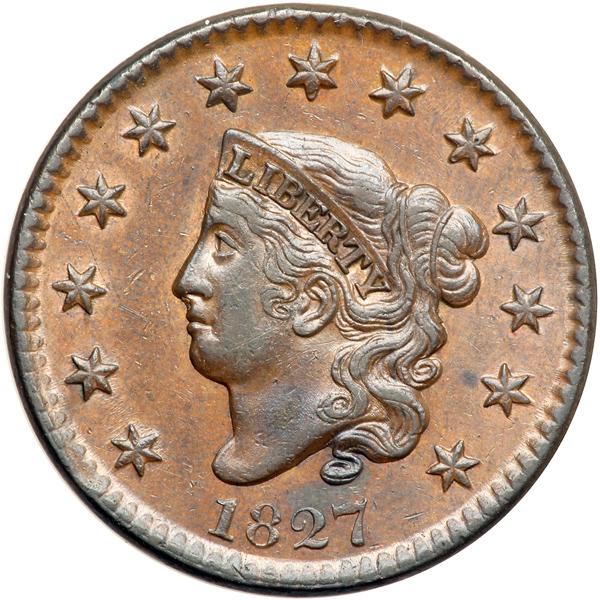 1827 N-10 R4+ EF45. Wright Plate Coin. EF-45. Close to AU50 sharpness but there are some light contact marks, mostly on the obverse. The notable marks are a faint hairline scratch from the field left of the date curving up through the bust tip and neck to the curl before the ear plus a shorter one along the jawline. Frosty light brown with steel brown toning on the highpoints and some slightly darker steel brown toning at the top of the 27 and on the bottom of the neck. There are hints of underlying very faded mint color peeking through in a couple of the protected areas. EDS. The obverse fields are slightly reflective thanks to a fresh die polishing and the reverse is rotated 10 degrees CW. This is the Wright plate coin for the variety (the curved hairline scratch from the bust tip described above is mistakenly reported as a die crack in the "Striking Variations" paragraph for the variety in John's book). Outstanding eye appeal for the grade in spite of the trivial contact marks. Called EF45 and CC#2 behind a marginally superior example in the Bland census with the next best grading only VF30. Noyes says EF45 net EF40 and tied for CC#2, his photo #25320. Removed from an NGC slab graded AU58BN (NGC label included). DWH #2602.