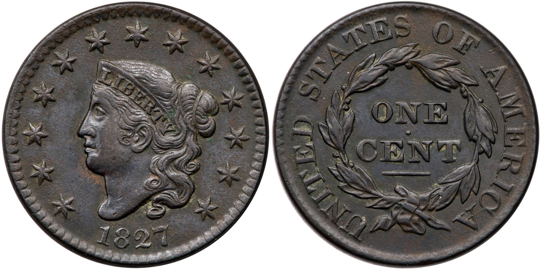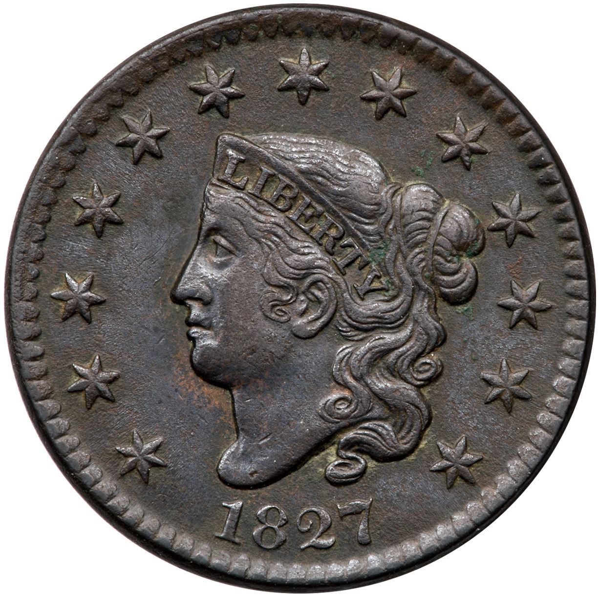 1827 N-11 R-1 VF35AU50 sharpness but lightly corroded with traces of old verdigris in the protected areas. Free of notable marks otherwise. Dark brown and charcoal surfaces. MDS, die state b.Certificate Number: Pedigree: Ex; Tim Paquette