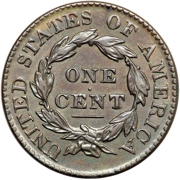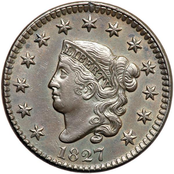 1827 N-11 R1 EF40. EF-40. Glossy light olive brown and steel with some frosty lighter golden steel brown in protected areas. The color is attractive and appears quite natural. The only notable marks are a nick on the rim above star 7 and a pair of tiny ticks on the font edge of the nose. E-MDS, without any crumbling at the brow and fine die flowlines in the obverse fields. The reverse is rotated 15 degrees CW. The obverse is slightly misaligned to K-7 while the reverse is centered on the planchet. DWH #0655.