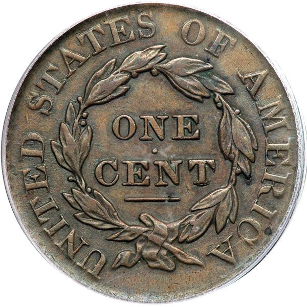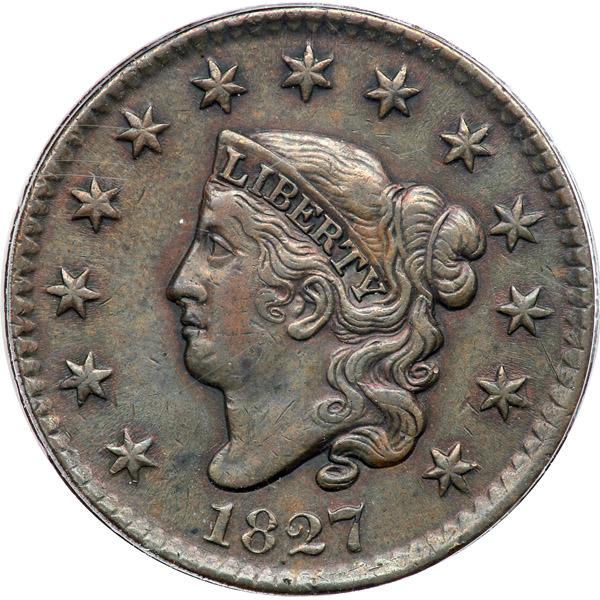 1827 N-11 R1. PCGS graded AU-50. Glossy light olive brown and chocolate with hints of lighter reddish steel brown toning in protected areas on the obverse, possibly from an old cleaning. No notable marks or other defects. LDS with crumbling at the forehead and upper lip. Our grade is VF35.