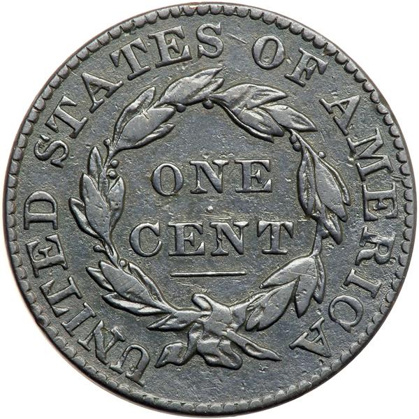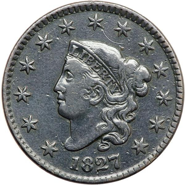 1827 N-12 R5 F15. Fine-15. Five points sharper with extremely fine roughness under a glossy dark olive and steel brown patina. No verdigris and the only notable contact mark is a short, light scratch arcing in the field under stars 7 & 8. Very rare EDS, before the obverse die cracked. In the lower half of the condition census for this rare variety but second finest of the early die state. DWH #3211.