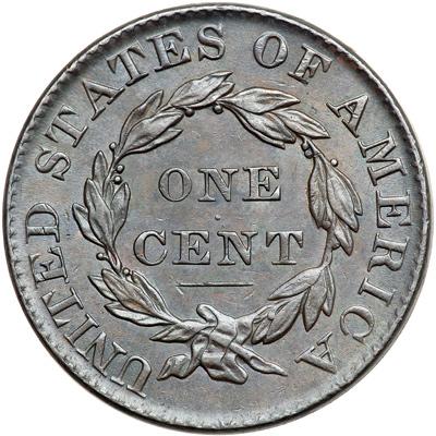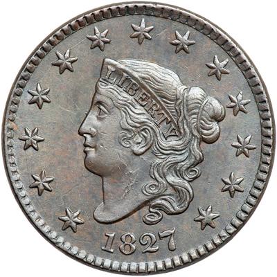 1827 N-3 R2. EF-45. Sharpness AU50 but there is a nick in the center of the neck. Otherwise this cent is flawless. Frosty olive and steel. Satiny mint luster covers the fields and protected areas, especially on the reverse. Nicely struck MDS with the usual irregular die cracks on the ear and neck.
