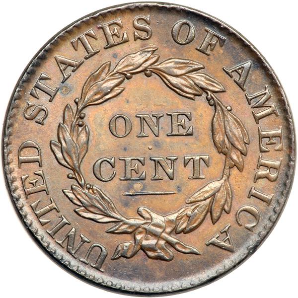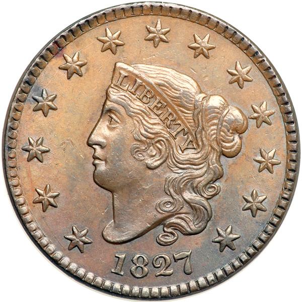 1827 N-3 R2. PCGS graded MS-63 Brown. Glossy tan and light steel brown with darker bluish steel brown highpoints and underlying frosty mint luster covering the fields. There are a few microscopic contact marks in the field right of star 3 and a dull rim nick at the second A in AMERICA. Excellent eye appeal. MDS. The fields are satiny from microscopic die flowlines and the fine die crack through stars 1-6 is clear. The always-present jagged die cracks on the neck are obvious. Our grade is AU50+. Pop 1; 1 in 66. Only 2 examples graded at PCGS for the variety. DWH #2657 (PCGS # 36844) .