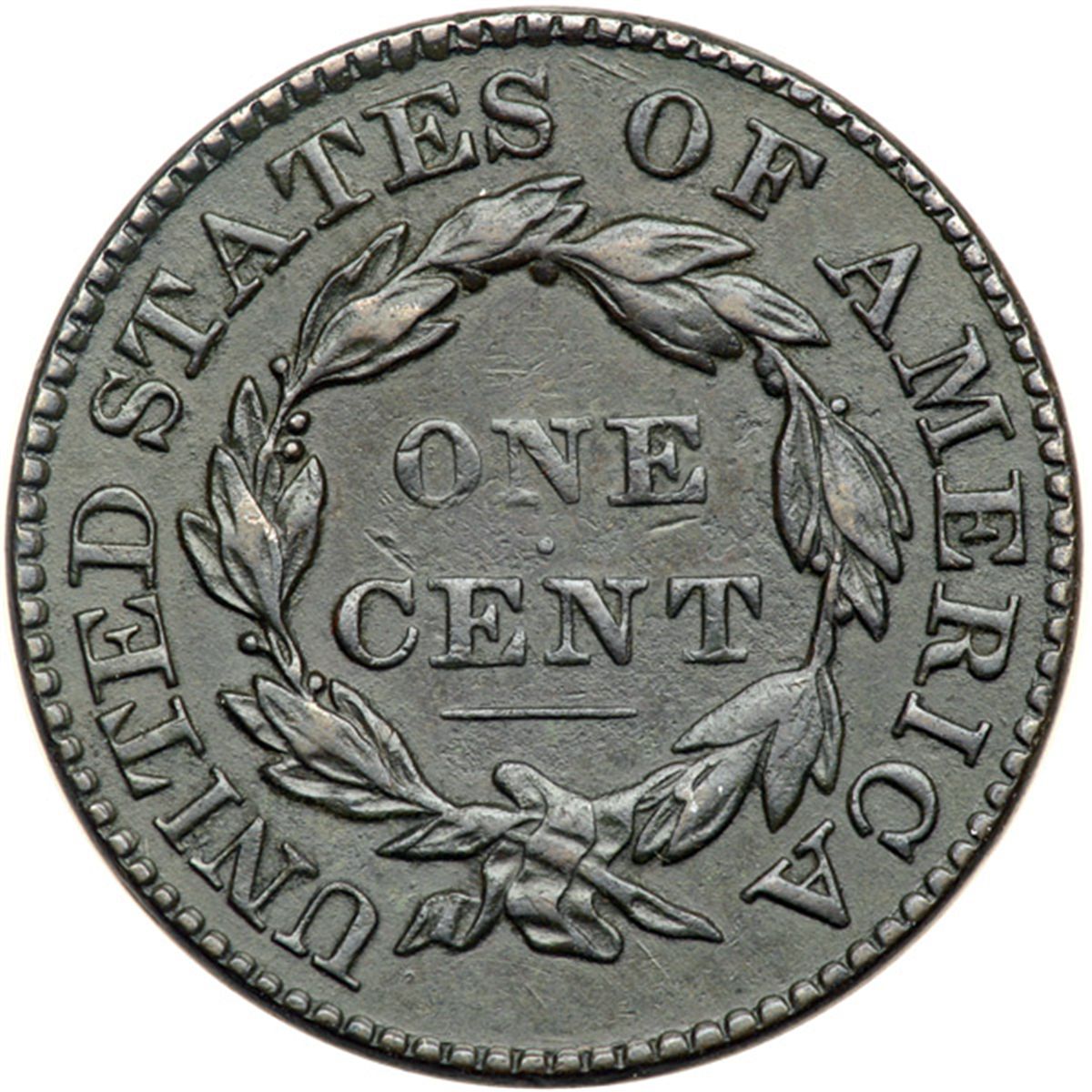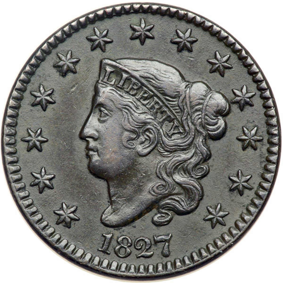 1827 N-5 R2 VF30. Slightly sharper but there is some fine crud in protected areas, mostly on the reverse. Otherwise this piece is void of defects other than a few trivial ticks. Glossy dark olive brown with frosty luster showing through in the protected areas. Nicely struck EDS.
