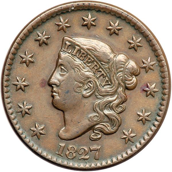1827 N-5 R2 VF35. VF-35. Nice glossy light to medium brown with a small spot of reddish brown toning in the field close off the nose tip and frosty flowline luster in protected areas. Smooth, free of contact marks. M-LDS with a clear die crack from the dentils under the left point of star 13 up to the curl near that star. DWH #0640.