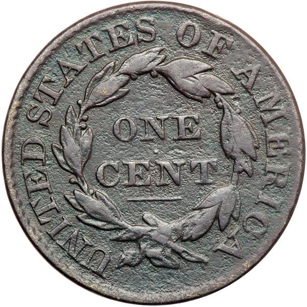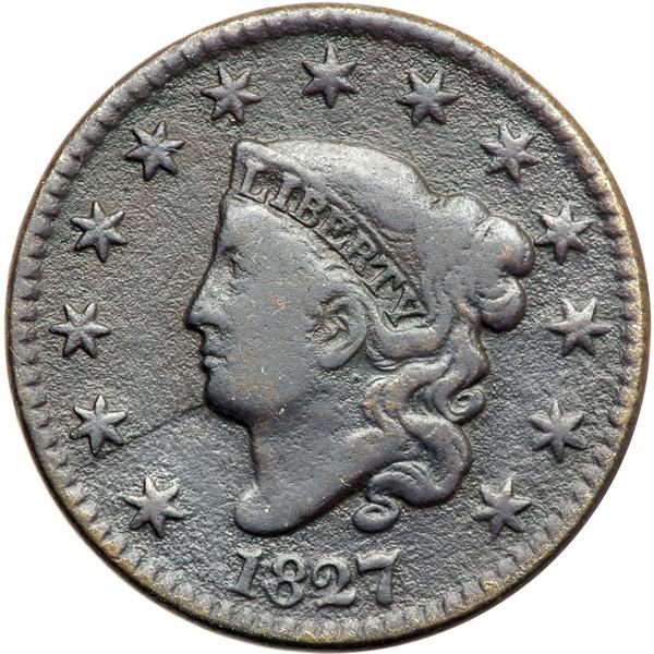 1827 N-5 R2 VG7. Unique Terminal Die State. VG-7. Sharpness F12 but covered with fine to moderate granularity under a slightly glossy dark olive and steel patina. There are specks of greenish verdigris dusted onto the reverse, but no marks or other notable defects. Unique terminal die state with a strong die crack from the dentils to the chin just touching the lower right point of star 2. An additional lighter crack extends down from the middle of the strong one through star 1 to the dentils below, but this crack is mostly lost in the roughness. The crack to the chin, however, is strong and unmistakable. The field below this crack is clearly lower than the field above the crack. Discovered by Jack Beymer. The die state was published in the Wright book on middle date cents in 1992, and to date no additional examples have been seen or reported. Noyes photo #28269. DWH #3244.