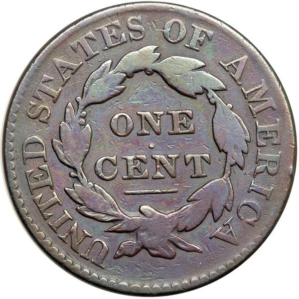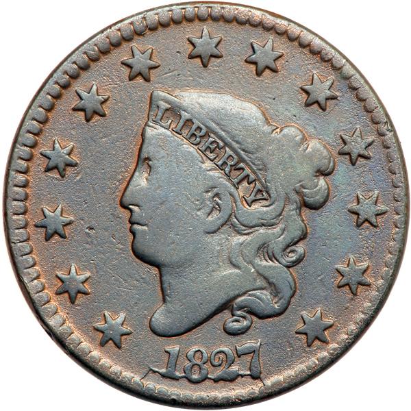 1827 N-6 R3 G5. Good-5. A couple points sharper but cleaned. The obverse is now retoned a slightly glossy bluish steel with tan in protected areas while the reverse is a glossy reddish steel and chocolate. No marks, but the obverse is covered with uniform extremely fine granularity. Extremely rare LDS with a slightly sunken retained cud break under the date. Called VG7 net G5 by Noyes, his photo #22383. DWH #1906.
