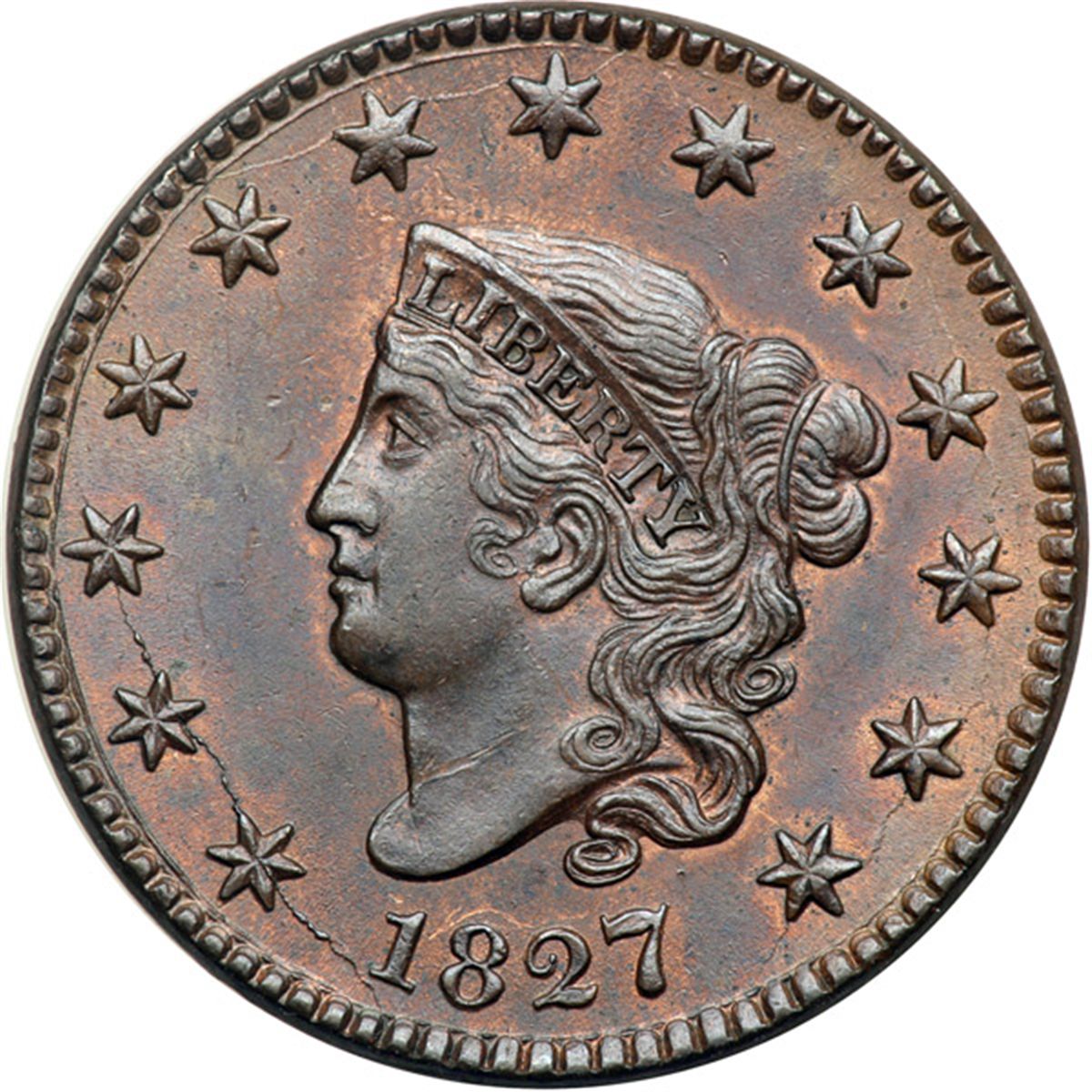 1827 N-8 R3 MS60. Lustrous steel brown and chocolate with underlying faded mint color covering the protected areas on the obverse. The reverse is a slightly lighter shade of brown mixed with subtle wisps of darker brown and olive, and hints of very faded mint color are peeking through in a couple places. Sharply struck and very attractive, the obverse nearly choice. The best identifying marks, and they are barely visible, are a couple faint ticks above the 18 that barely break the satiny frost and a small rim nick over the F in OF. An important new discovery rescued from eBay.