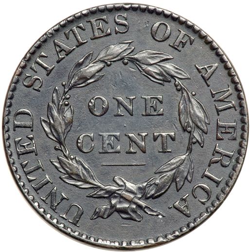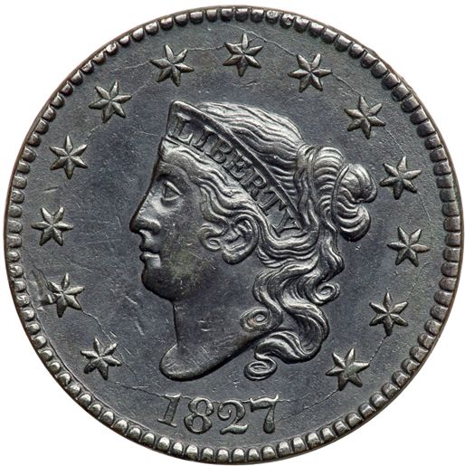 1827 N-9 R3 VF35. Sharpness EF40 but the color is darker than you like to see on a higher grade large cent. No roughness or verdigris and only a few trivial marks, including a shallow planchet flake at the dentils left of star 2 and two tiny ticks on the left side of the O in ONE. Glossy dark olive and steel. MDS. Removed from an ANACS slab graded EF45 (ANACS label included, and it shows the attribution).
