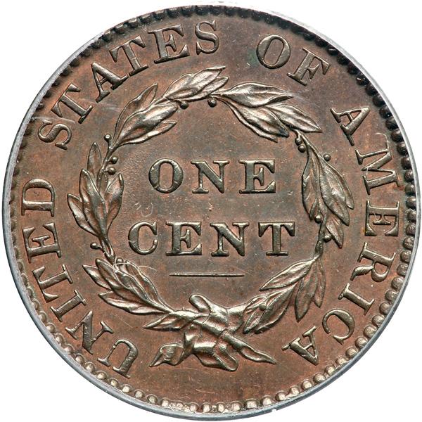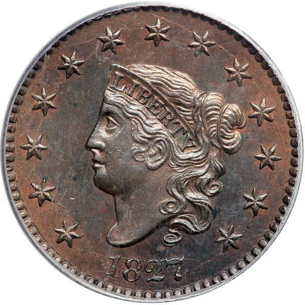 1827 N-9 R3. PCGS graded MS-63 Brown. Frosty medium brown and olive with lighter brown and tan faded down from mint color in protected areas. The fields are hard and slightly reflective but covered with fine hairlines that are clearly visible on the obverse. A diagonal nick-like pre-striking planchet mark is located just right of the eye and there is a small spot of very fine carbon over the 2 in the date. Sharply struck MDS with the always present die cracks connecting the stars and date (an example with an uncracked obverse is unknown and probably does not exist). The stars have full radial lines, the inner circle segments on the obverse are sharp, and the portrait details are crisp. Fine die flowlines are just starting to show in the obverse fields near the dentil tips. Called MS60 and CC#1 as the only mint state example in the Noyes census, his photo #20927. Bland says MS60 and tied for CC#1 with one other piece followed by a pair of AU examples. Obviously this is a variety that is difficult to locate in mint state. Our grade is AU58. Pop 1; The only example graded at PCGS for the variety. DWH #3537 (PCGS # 36862) .