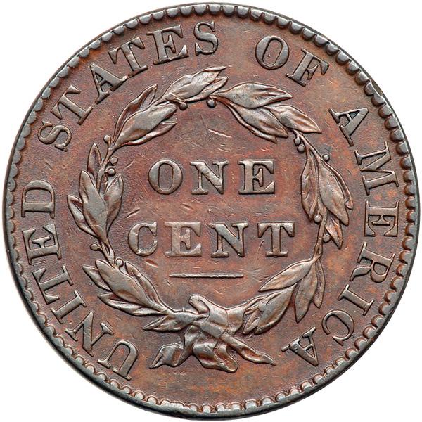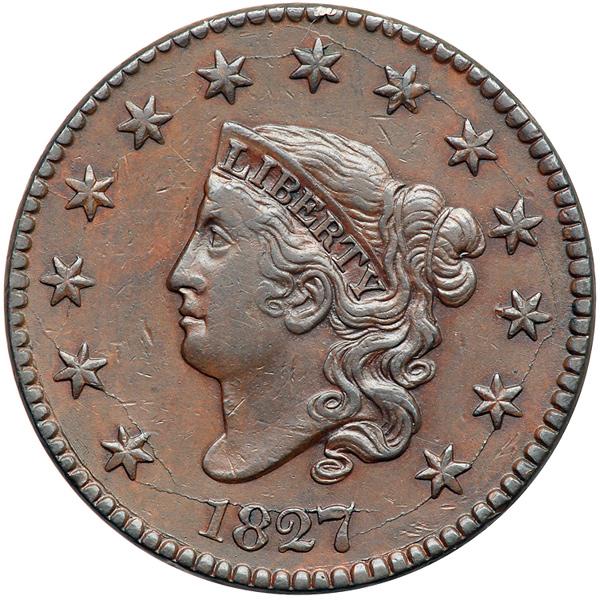 1827 N-9 R3. VF-35. Five points sharper but there are a few small contact marks, including a rim nick over star 7 and a small rim bruise at the bottom of the reverse. Glossy reddish chocolate with darker steel brown toning on the highpoints. MDS with the usual die crack through the date and stars.