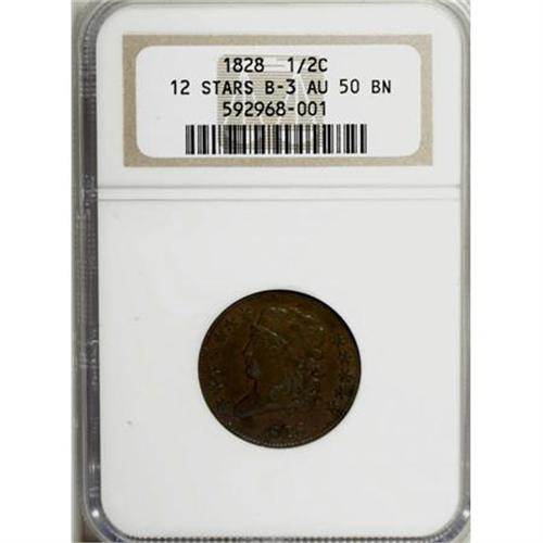 <B>1828 1/2 C 12 Stars AU50 NGC.</B></I> B-3. NGC Census: (10/110). PCGS Population (17/73). Mintage: 606,000. Numismedia Wsl. Price for NGC/PCGS coin in AU50: $315. (#1150)<BR><BR><B>Coin Engraver:</B> John Reich<BR><BR><b>Shipping:</b> Coins & Currency (<a target="_blank" href="http://www.heritageauctions.com/common/shipping.php">view shipping information</a>)