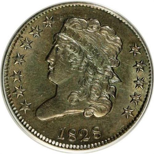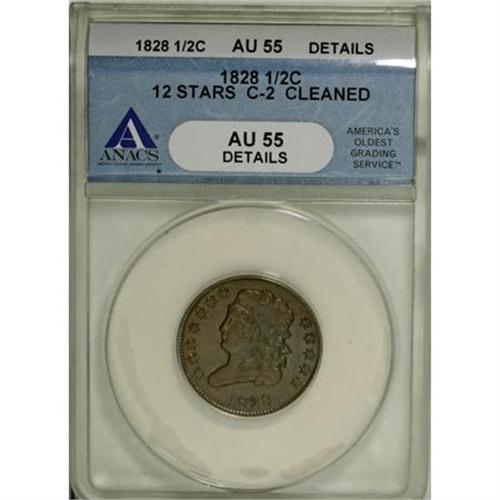 <B>1828 1/2 C 12 Stars--Cleaned--ANACS. AU55 Details</B></I>. C-2. NGC Census: (22/79). PCGS Population (14/53). Mintage: 606,000. Numismedia Wsl. Price for NGC/PCGS coin in AU55: $350. (#1150)<BR><BR><B>Coin Engraver:</B> John Reich<BR><BR><b>Shipping:</b> Coins & Currency (<a target="_blank" href="http://www.heritageauctions.com/common/shipping.php">view shipping information</a>)