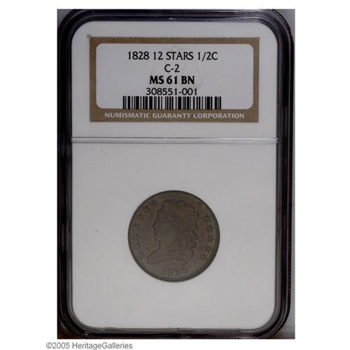 <B>1828<1/2 C> 12 Stars MS61 Brown NGC.</B></I> B-3, C-2, R.2. Generally well struck with semi-glossy dark-brown patina and reddish undertones. A few tiny marks are noted on the obverse.