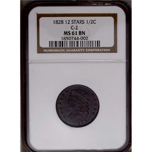 <B>1828<1/2 C> 12 Stars MS61 Brown NGC.</B></I> C-2, B-3, R.2. Traces of red color appear on the medium-brown surfaces. Nicely struck for this issue with light marks on each side. EAC 45.