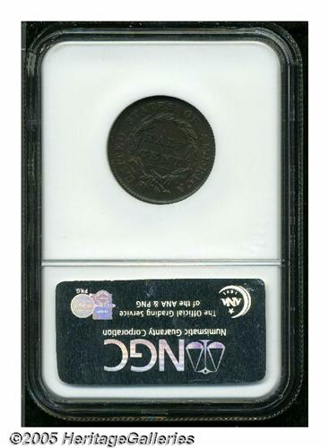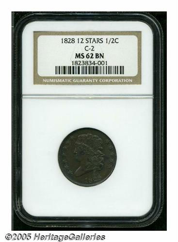 <B>1828<1/2 C> 12 Stars MS62 Brown NGC.</B></I> B-3, C-2, R.2. Rich golden-brown and aquamarine hues endow this crisply struck Half Cent, which is undisturbed except for a single contact mark beneath the F in HALF. A curious variety, apparently the absent-minded engraver simply forgot to punch the final star into the obverse die. Population: 9 in 62, 14 finer (3/05).