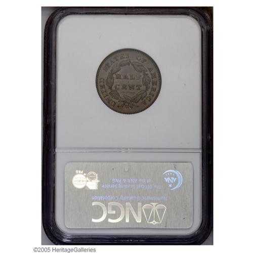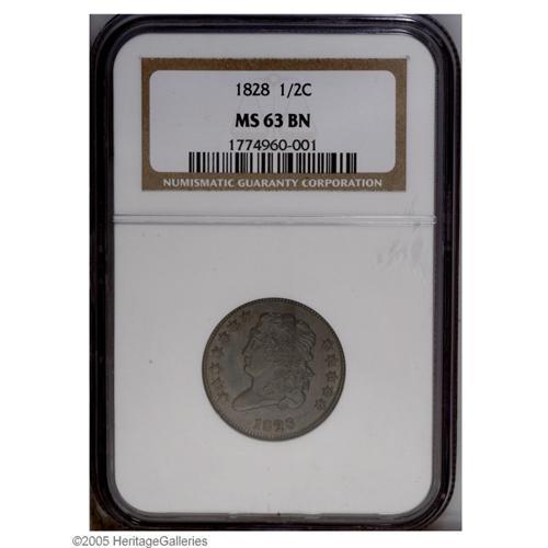 <B>1828<1/2 C> 12 Stars MS63 Brown NGC.</B></I> B-3, C-2, R.2. A curious mint blunder, apparently the engraver absent-mindedly neglected to enter the final star, since there was space for it on the obverse die. Although designated as Brown, strong undertones of rose color are noted near the obverse periphery and in the reverse field areas. A carefully preserved if typically struck representative.