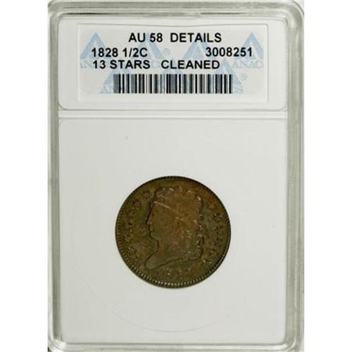 <B>1828 1/2 C 13 Stars--Cleaned--ANACS. AU58 Details.</B></I> NGC Census: (128/322). PCGS Population (84/186). Mintage: 606,000. Numismedia Wsl. Price for NGC/PCGS coin in AU58: $158. (#1147)<BR><BR><B>Coin Engraver:</B> John Reich<BR><BR><b>Shipping:</b> Coins & Currency (<a target="_blank" href="http://www.heritageauctions.com/common/shipping.php">view shipping information</a>)