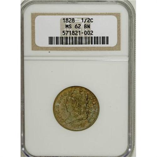 <B>1828 1/2 C 13 Stars MS62 Brown NGC.</B></I> NGC Census: (89/199). PCGS Population (32/137). Mintage: 606,000. Numismedia Wsl. Price for NGC/PCGS coin in MS62: $225. (#1147)<BR><BR><B>Coin Engraver:</B> John Reich<BR><BR><b>Shipping:</b> Coins & Currency (<a target="_blank" href="http://www.heritageauctions.com/common/shipping.php">view shipping information</a>)