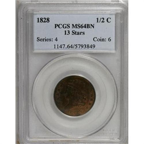 <B>1828 1/2 C 13 Stars MS64 Brown PCGS.</B></I> PCGS Population (51/11). NGC Census: (84/16). Mintage: 606,000. Numismedia Wsl. Price for NGC/PCGS coin in MS64: $452. (#1147)<BR><BR><B>Coin Engraver:</B> John Reich<BR><BR><b>Shipping:</b> Coins & Currency (<a target="_blank" href="http://www.heritageauctions.com/common/shipping.php">view shipping information</a>)