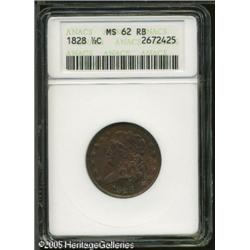 <B>1828 1/2 C 13 Stars MS62 Red and Brown ANACS.</B></I> C-3, B-2, R.1. This is the common 13 Stars variety. Two other die marriages include the 12 Stars variety and the scarce 13 Stars variety. Satiny luster is accented by pinkish orange color and steel brown toning. Lot:5088