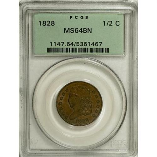 <B>1828 1/2 C 13 Stars MS64 Brown PCGS.</B></I> C-3, B-2, R.1. The obverse has light brown surfaces with clear red accents, while the reverse has similar color at the periphery with a medium brown center. Nicely struck and luminous with a single darkly toned hair curl just below the headband. In a green label holder. EAC 50.<BR><BR><b>Shipping:</b> Coins & Currency (<a target="_blank" href="http://www.heritageauctions.com/common/shipping.php">view shipping information</a>)
