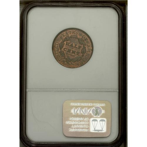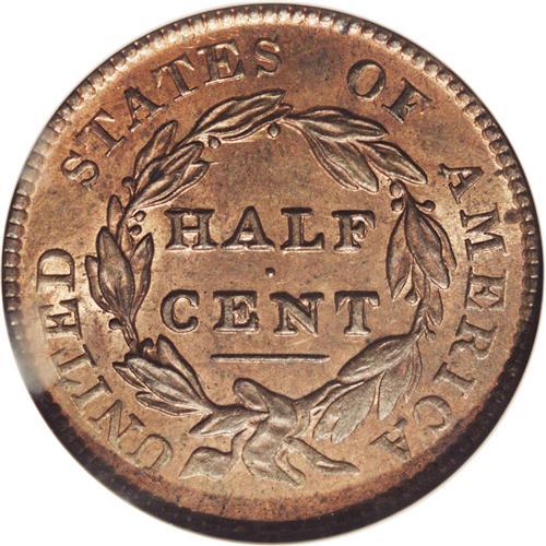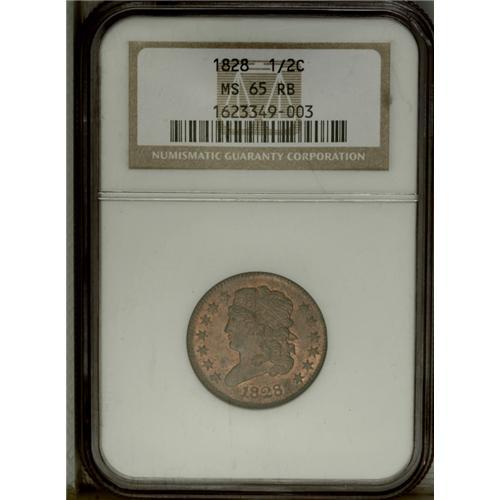 <B>1828 1/2 C 13 Stars MS65 Red and Brown NGC.</B></I> C-3, B-2, R.1. Both 12 and 13 Stars obverse dies were created in 1828, with the 13 Stars obverse lasting through two reverse dies. Three varieties are known in total. This C-3 die marriage is the most commonly seen variety of the year, often found in full Mint State grades due to one or more old hoards. This lovely example has considerable bright orange mint luster with hints of light brown color on the devices. EAC 62.<BR><BR><b>Shipping:</b> Coin/Currency (<a target="_blank" href="http://www.heritageauctions.com/common/shipping.php">view shipping information</a>)