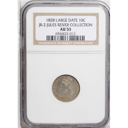 <B>1828 10C Large Date AU53 NGC.</B></I> JR-2, R.3. Reiver state a. Pleasing golden toning with luster in the protected areas. Most design features are sharp save for softness on some of the obverse stars and at the eagle's head and claws. Magnification reveals two faint scratches on Liberty's neck.<BR><BR><b>Shipping:</b> Coin/Currency (<a target="_blank" href="http://www.heritageauctions.com/common/shipping.php">view shipping information</a>)
