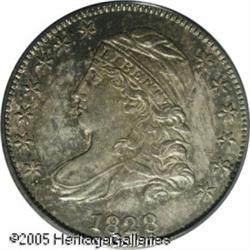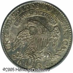 <B>1828 10C Small Date MS63 PCGS.</B></I> JR-1, R-2. Rich sea-green and honey colors embrace this lightly marked example. The borders are intricately struck, while the eagle's neck shows only slight softness of definition. Struck from a prominently clashed reverse die, however, careful examination does not reveal any mentionable marks. The last open collar issue of the denomination. Only two die pairings for this year, each receives a separate <I>Guide Book</B></I> listing. Population: 7 in 63, 7 finer (1/05). Lot:6186