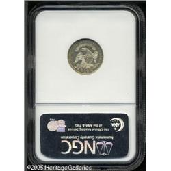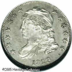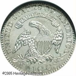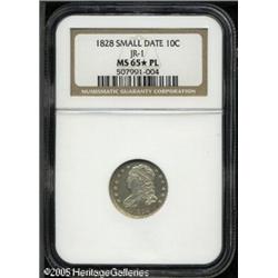 <B>1828 10C Small Date MS65 <img border='0' src='http://www.heritagecoins.com/images/star.gif' width=10 height=10> Prooflike NGC.</B></I> JR-1, R.2. Simply astounding quality for this or any other Small Size Bust Dime. Basically untoned surfaces are boldly detailed save for minor softness on the eagle's neck feathers, with die clashing being more noticeable on the reverse. The depth of the mirrored reflectivity is so pronounced that one has to wonder if this coin was used as some type of presentation piece to show off the capabilities of the Mint's new equipment, first used in 1828. The fragile fields display a few scattered flecks of toning scattered about and the most inconsequential scuffiness is unfairly heightened by the glassy finish. Just two die varieties are known for this date, both of which merit separate <I>Guide Book</B></I> listings due to differences in the size of the date logotype and other slight modifications in the design that occurred this year. Population: 1 in 65 (omitting the prooflike and star designations), 1 finer (1/05). Lot:6187