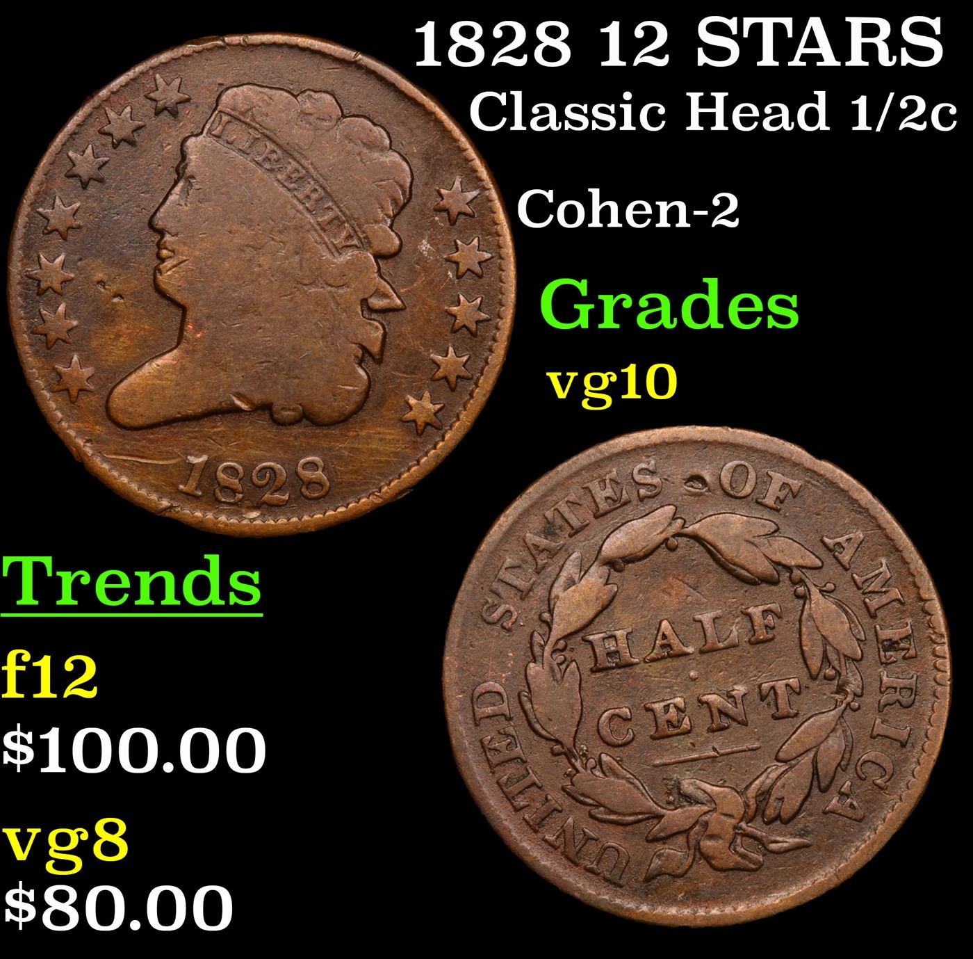 1828 12 STARS Classic Head half cent 1/2c Grades vg+.