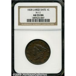 <B>1828 1C Large Narrow Date AU55 NGC.</B></I> N-11, R.2. A golden-brown representative that has some selected areas of deeper mahogany patina. A couple of toned-over handling marks on the left obverse field, but generally smooth for the certified grade.