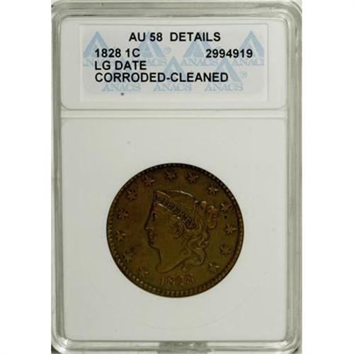 <B>1828 1C Large Narrow Date--Cleaned, Corroded--ANACS. AU58 Details.</B></I> NGC Census: (22/43). PCGS Population (6/18). Mintage: 2,260,624. Numismedia Wsl. Price for NGC/PCGS coin in AU58: $392. (#1654)<BR><BR><B>Coin Engraver:</B> Robert Scot or John Reich<BR><BR><b>Shipping:</b> Coins & Currency (<a target="_blank" href="http://www.heritageauctions.com/common/shipping.php">view shipping information</a>)
