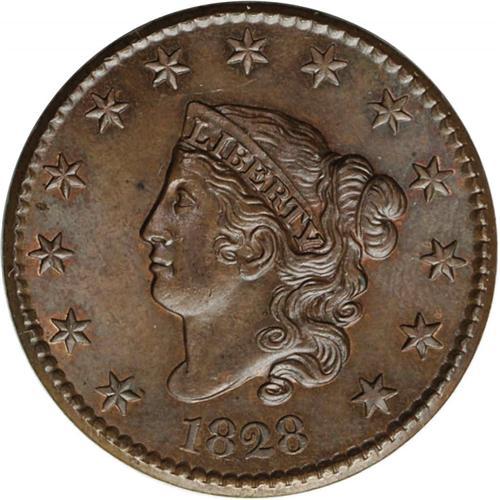 1828 1C Large Narrow Date. N-9, R.4. MS65 Brown NGC. M 1828[1C] Large Narrow Date. N-9, R.4. MS65 Br
