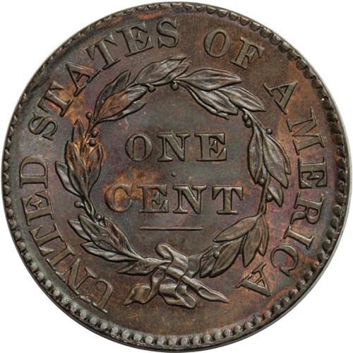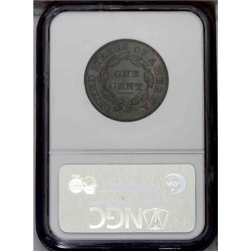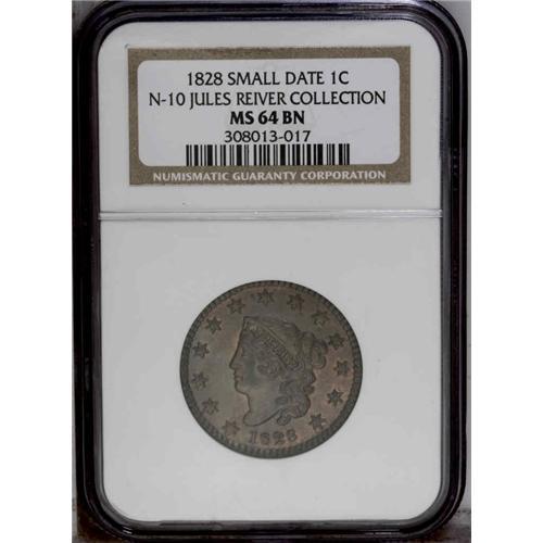 <B>1828<1C> Small Wide Date. N-10, R.1. MS64 Brown NGC. AU50 EAC.</B></I> A lustrous example, well struck aside from a few star centers. Despite the Brown designation, glimpses of orange-red color emerge, particularly on the obverse. Medium brown color, however, occupies the majority of the obverse, and the reverse is dominated by deep and original apple-green toning. Thorough evaluation locates faint obverse marks, but certainly an important example of this sole Small Date marriage.<BR><I>Ex: Kingman; C. Douglas Smith (8/12/1969).</B></I> Envelope Included.