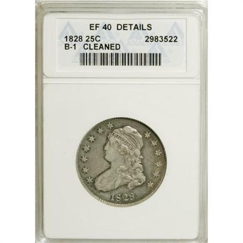 <B>1828 25C 25/50C--Cleaned--ANACS. XF40 Details.</B></I> B-1. NGC Census: (0/7). PCGS Population (2/9). Numismedia Wsl. Price for NGC/PCGS coin in XF40: $1,525. (#5343)<BR><BR><b>Shipping:</b> Coins & Currency (<a target="_blank" href="http://www.heritageauctions.com/common/shipping.php">view shipping information</a>)
