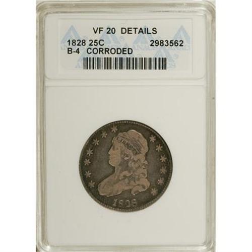 <B>1828 25C 25/50C--Corroded--ANACS. VF20 Details.</B></I> B-4. NGC Census: (0/8). PCGS Population (2/12). Numismedia Wsl. Price for NGC/PCGS coin in VF20: $900. (#5343)<BR><BR><b>Shipping:</b> Coins & Currency (<a target="_blank" href="http://www.heritageauctions.com/common/shipping.php">view shipping information</a>)