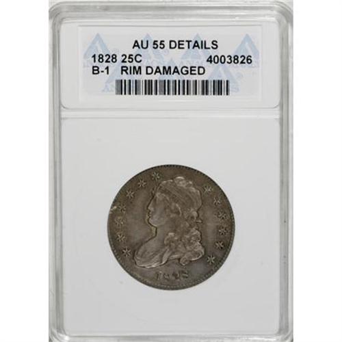 <B>1828 25C --Rim Damaged--ANACS. AU55 Details.</B></I> B-1, R.1. A gunmetal-gray Capped Bust quarter with attractive surfaces despite a brief, bright obverse edge mark at 9:30. Boldly brought up except for the LU in PLURIBUS.<BR><BR><B>Coin Engraver:</B> John Reich<BR><BR><b>Shipping:</b> Coins & Currency (<a target="_blank" href="http://www.heritageauctions.com/common/shipping.php">view shipping information</a>)