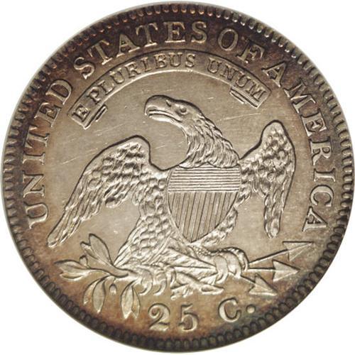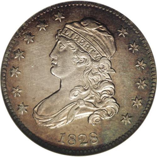 <B>1828<25C> AU58 NGC.</B></I> B-4, R.3. This variety shows a close date on the obverse, while on the reverse there is less space between STATES and OF and between OF and AMERICA than on the B-2 variety. The present specimen shows pretty light peripheral iridescent toning on both sides in hues of sunset-orange, amber, and azure. Fairly well struck, with only the usual weakness on the eagle's claws.