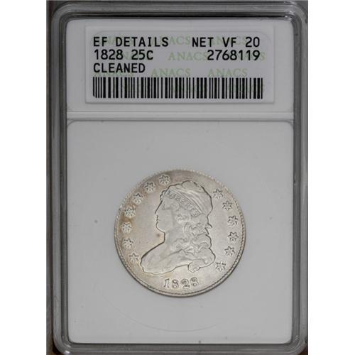 <B>1828<25C>--Cleaned--ANACS. XF Details, Net VF20.</B></I> B-1, R.1. This hairlined and bright example is largely untoned, but the left borders exhibit golden freckles. The eagle possesses ample plumage detail.