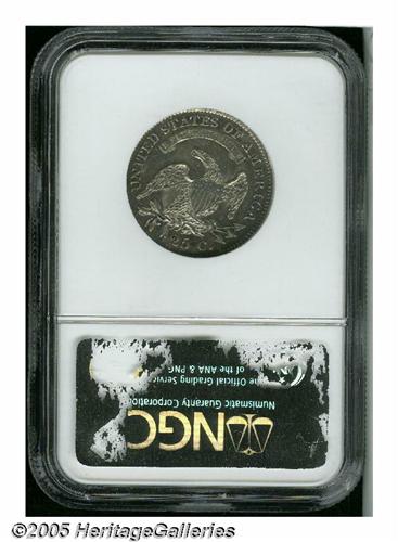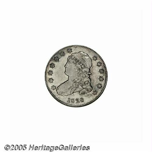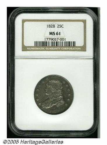 <B>1828<25C> MS61 NGC.</B></I> B-1, R.1. Widely spaced date, curly 2 in the denomination. A sharply struck and rather prooflike piece that displays consistent steel-gray color. A handling mark is on the jaw, however, no other abrasions are individually worthy of mention. As a type, the Capped Bust Quarter is much scarcer in Mint State than the Half Dollar of the same design.
