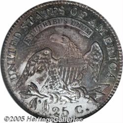 <B>1828 25C MS65 NGC.</B></I> B-1a, R.1.Toned with mottled deep green and gold on the lower two thirds of the obverse, with the upper portions a steel light gray color with some toning. Matched on the reverse where the lower portion is lighter, and the tonight ranges through deep blue, green and russet with luster through the peripheral lettering. Rather sharp on all but the uppermost curls of Liberty, and all the stars show full radial lines to the centers. A very scarce coin in Gem condition, with just a handful seen that qualify at this level and just a single coin graded higher by the two major services. One for the type collector who demands excellent surfaces and attractive toning. Population: 3 in 65, 1 finer (2/05).