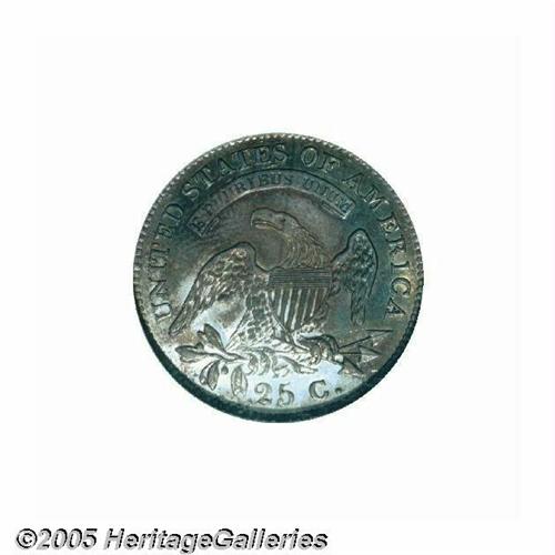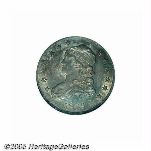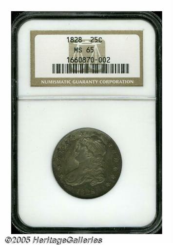 <B>1828<25C> MS65 NGC.</B></I> B-1a, R.1.Toned with mottled deep green and gold on the lower two thirds of the obverse, with the upper portions a steel light gray color with some toning. Matched on the reverse where the lower portion is lighter, and the tonight ranges through deep blue, green and russet with luster through the peripheral lettering. Rather sharp on all but the uppermost curls of Liberty, and all the stars show full radial lines to the centers. A very scarce coin in Gem condition, with just a handful seen that qualify at this level and just a single coin graded higher by the two major services. One for the type collector who demands excellent surfaces and attractive toning. Population: 3 in 65, 1 finer (6/05).
