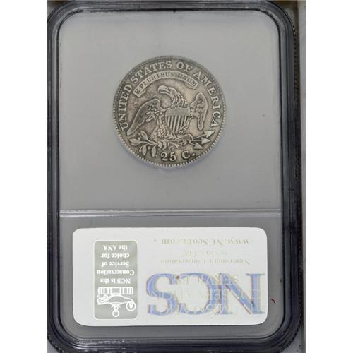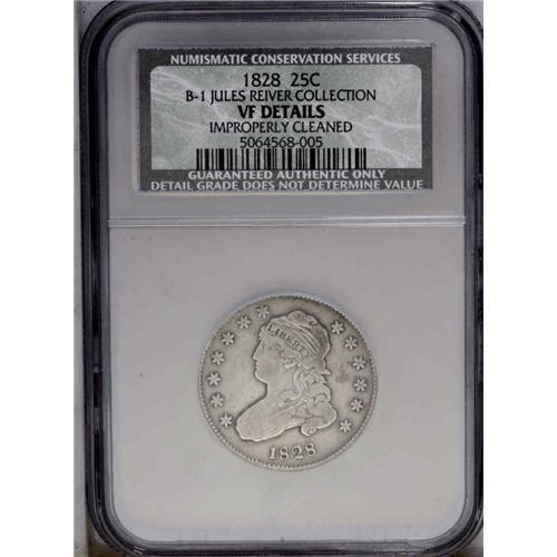 <B>1828<25C> Normal Reverse. B-1, R.1--Improperly Cleaned--NCS. VF Details. Die State IV.</B></I> Star 7 repunched; Scroll begins below upright of D. This later die state shows a crack through the left pair of leaves, close to the wing tip and terminating near the U of UNITED. Another fainter die crack extends from the scroll to AME. The obverse appears to have more cleaning lines while the reverse shows mottled gold and gray toning.<BR><I>Ex: Paul Padget (7/1986).</B></I> Envelope Included.