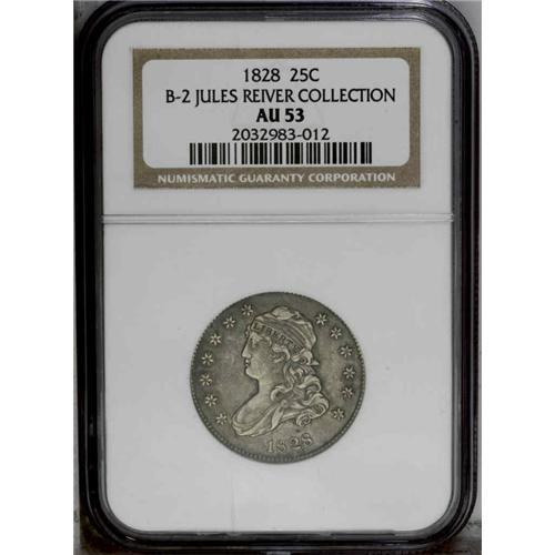<B>1828<25C> Normal Reverse. B-2, R.4. AU53 NGC. Usual Die State.</B></I> Star 7 repunched; Spine left from lowest arrow point. Dark silver and attractive for the grade. The surfaces are clean and show minimal signs of contact. This is the scarcest variety of the year, and a coin that any collector would be proud to own.<BR><I>Ex: J.J. Teaparty (1/1984).</B></I> Envelope Included.