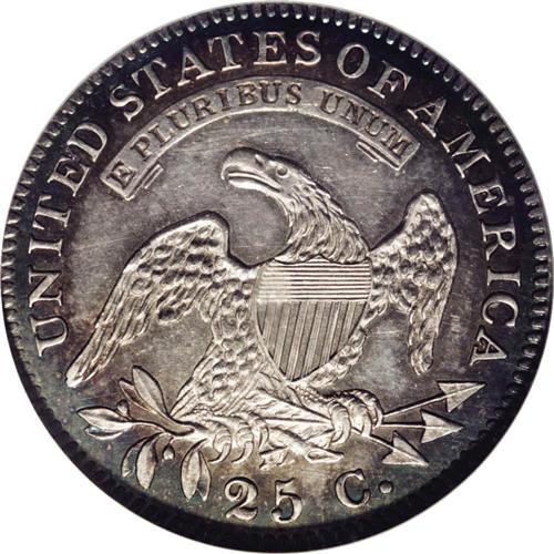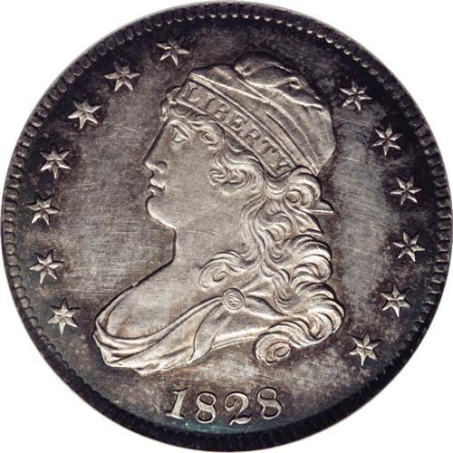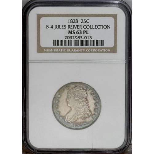 <B>1828<25C> Normal Reverse. B-4, R.3. MS63 PL NGC. Usual Die State.</B></I> Star 1 distant from bust; Scroll begins below right side of E. Although this is not a particularly rare coin, it is remarkable for its exceptional quality. The variety is quite rare in any Mint State grade, and only two or three prooflike examples exist. In addition, perhaps eight or nine Proofs are known. Although the surfaces have a few faint hairlines, and the reverse has a few tiny nicks, this is a lovely coin with exceptional aesthetic appeal. It should prove to be a treat to the connoisseur. It is sharply struck and has fully mirrored fields surrounding all the devices. The junction between fields and devices is precisely defined. Both surfaces have light ivory color at the centers, with vivid blue and green toning near the borders. Some who have viewed this coin have questioned why it is not a proof. In fact, it meets nearly all of our qualifications for an early proof coin, although others are known to show this similar reflective mirror field surface on the obverse and reverse. Great quality regardless of the actual minting status.<BR><I>Ex: Windsor Collection (Quality Sales, 11/1981), lot 979.</B></I> Envelope Included.