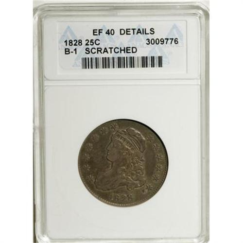 <B>1828 25C --Scratched--ANACS. XF40 Details.</B></I> B-1, R.1. Lightly circulated and luminous beneath layers of olive-gold and violet patina. The surfaces display a number of pinscratches and a small gouge to the right of the date, though the piece retains considerable eye appeal.<BR><BR><B>Coin Engraver:</B> John Reich<BR><BR><b>Shipping:</b> Coins & Currency (<a target="_blank" href="http://www.heritageauctions.com/common/shipping.php">view shipping information</a>)